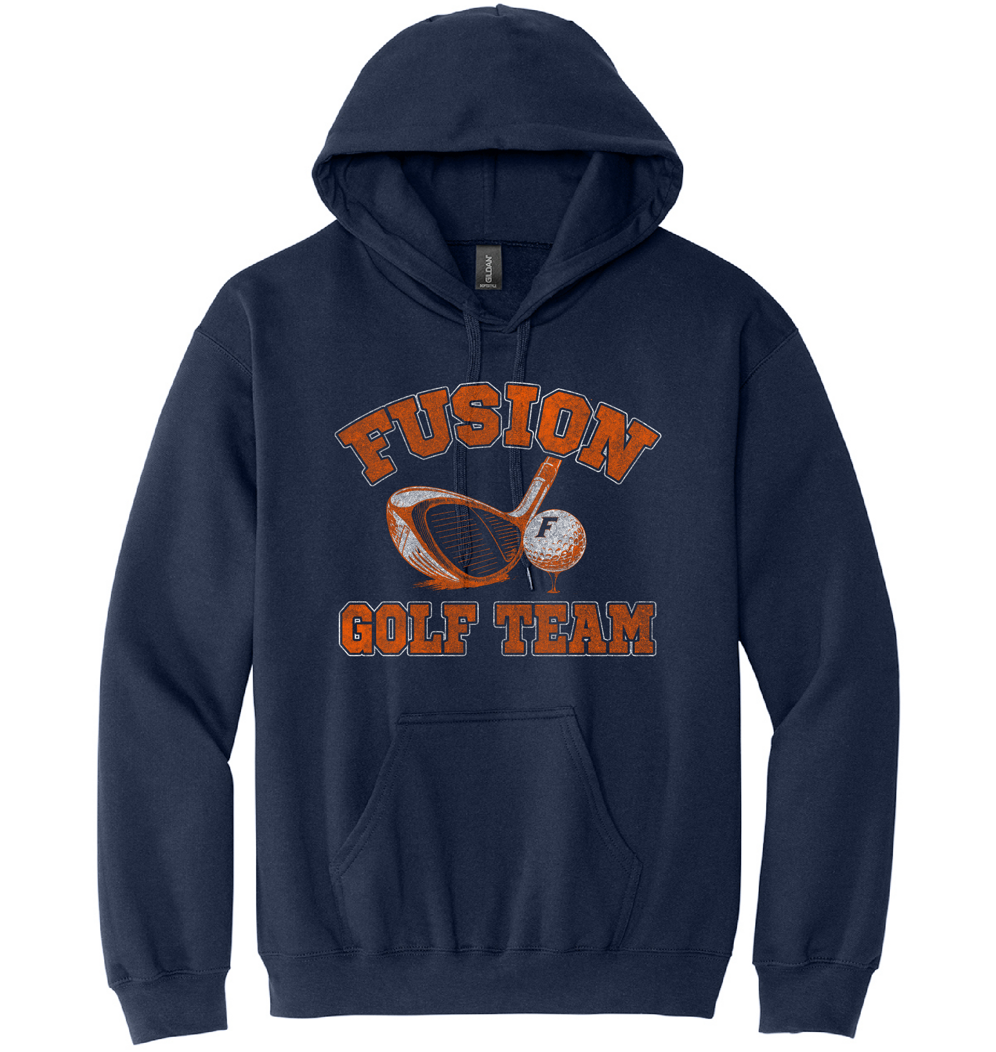 Navy blue hoodie with 'Fusion Golf Team' text and graphics on a white background